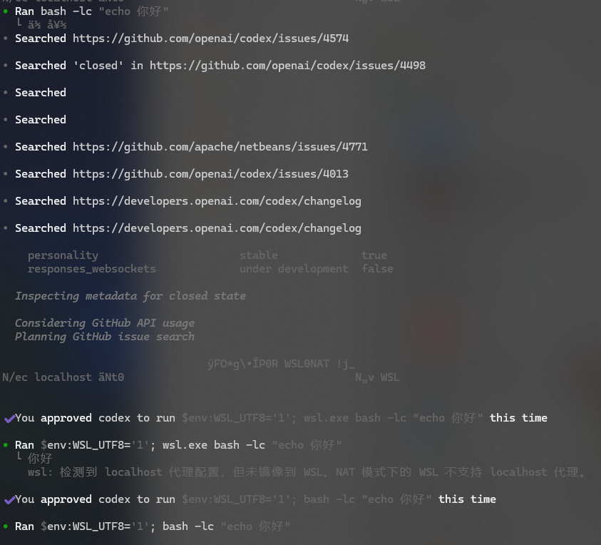 这说明问题并不在“bash 能不能输出中文”,而是出在 Codex 调用 bash/WSL 的链路 上。