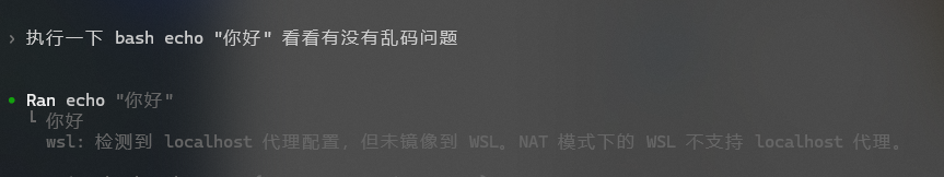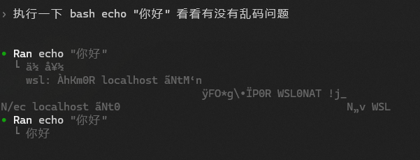 bash -lc "echo 你好",输出正常。 - 让 Claude Code 帮我执行 bash,输出也正常。